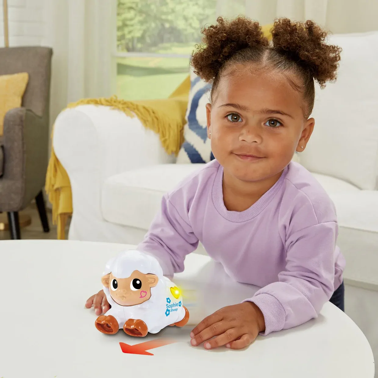 Press my light up heart button to trigger fun music, sounds and songs. Push me along for more reactions or press my cheek to hear me Baa and kiss!