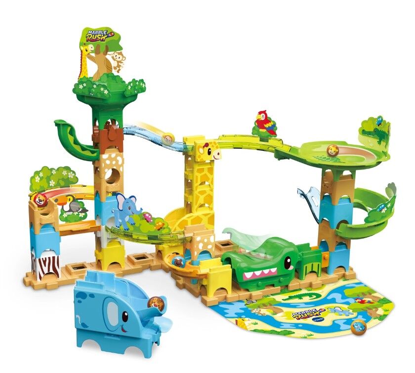 • Watch marbles whirl and spin through a swirling vortex, blast off from the elephant’s trunk shooter, and store them safely in the alligator marble keeper.