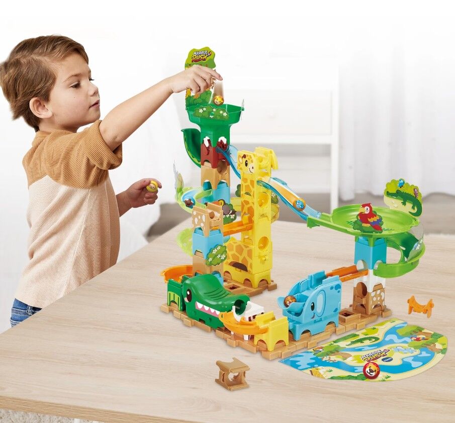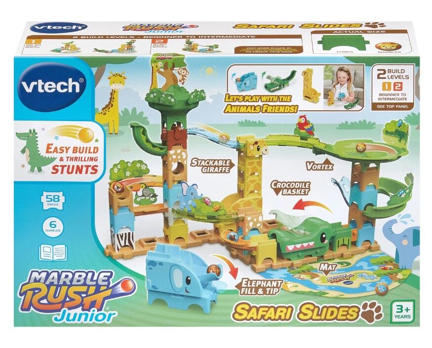 Bring the jungle to life with the Marble Rush Junior Safari Slides by VTech, a fun and colourful building playset packed with animal excitement. Kids can play with their alligator, giraffe, and elephant friends as marbles spin through a swirling vortex, launch from the elephant’s trunk shooter, and store neatly in the alligator marble keeper. With 45+ easy-to-build pieces and 6 marbles, children can have endless fun and exciting jungle adventures. Perfect for hands-on, non-electronic play that encourages creativity and learning.