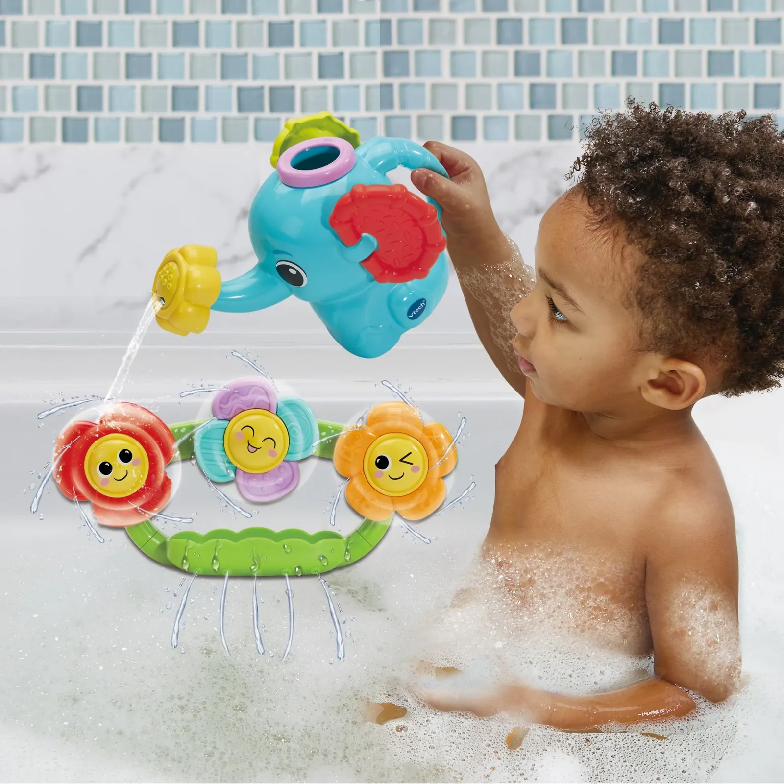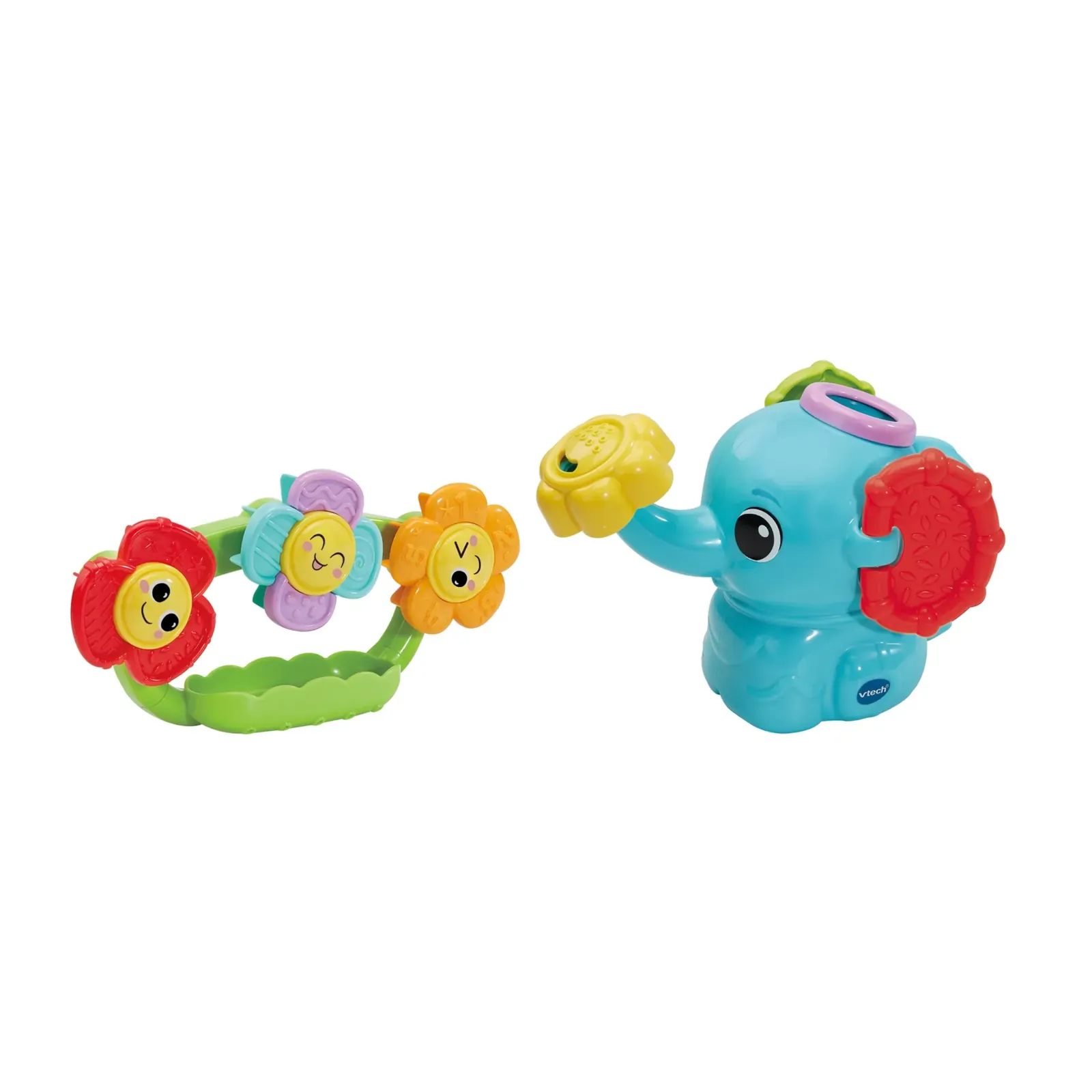 Tilt the cheerful elephant’s trunk to pour water, making flowers spin and twirl. With tactile textures and a suction cup, this toy sparks fun and sensory play.