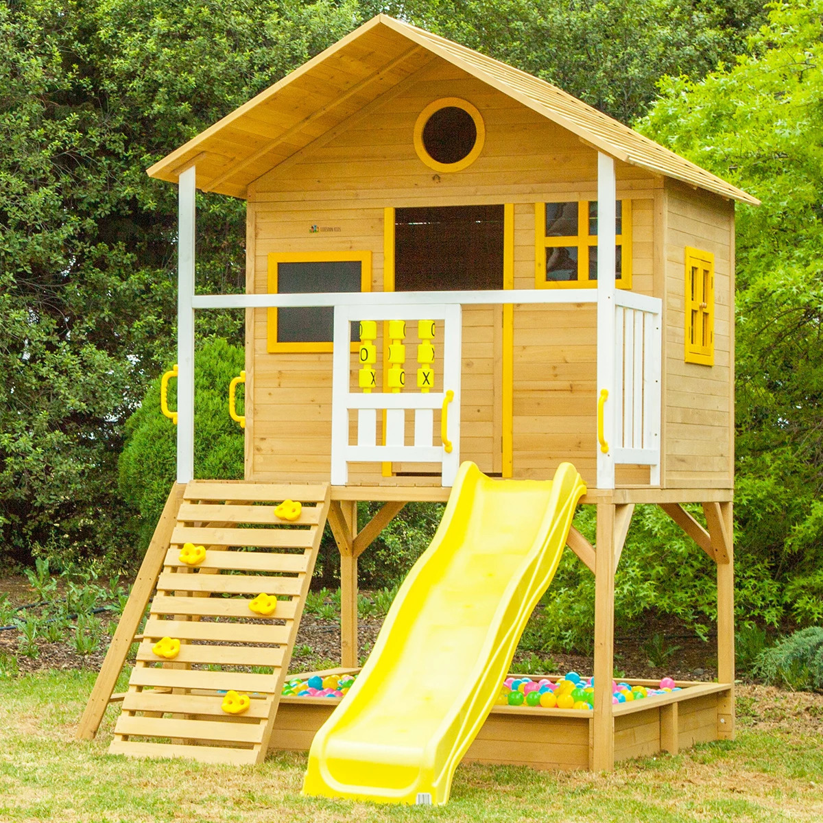 Capture the beach feeling in your backyard with the Warrigal Cubby House. This Queenslander style playhouse offers relaxed beach vibes for your kids in the massive sandpit under the raised Warrigal. Fun is on the horizon with a chalkboard, noughts and crosses, rock climbing wall, and a 2.2m wavy slide.