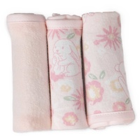 • Soft plush coordinating bunny hooded towel and washers emblazoned with delightful artwork.