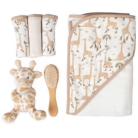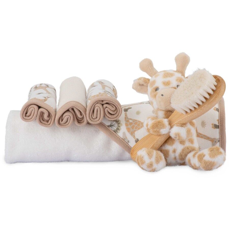 Roll into bath time with Stevie Necks Giraffe in a gift set with cosy towel, plush washers, gentle baby brush and a cool, rockin’ plush toy.