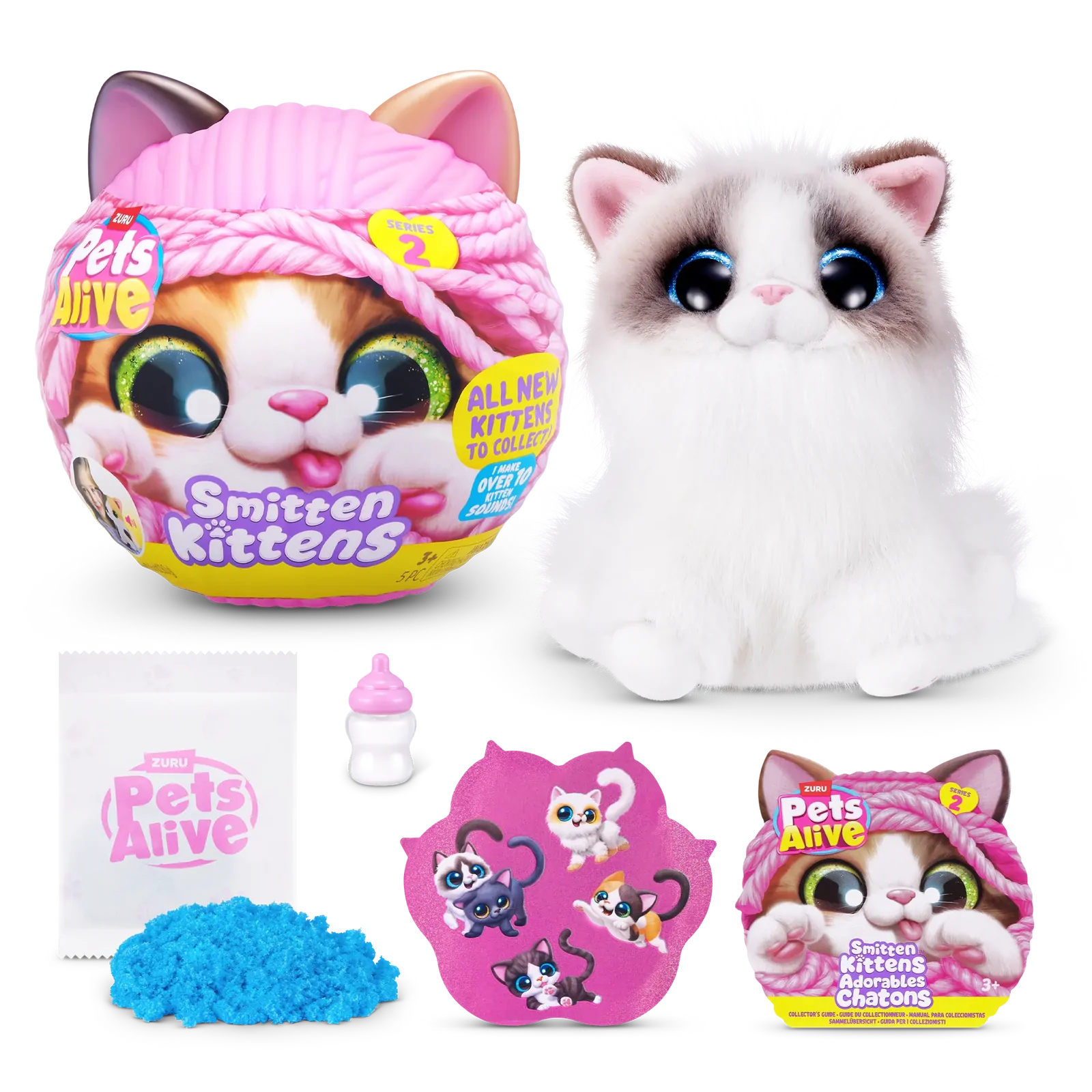 Feed your kitten with the included milk bottle to activate sweet reactions and nurturing play. Each surprise capsule includes five fun pieces like kinetic sand, stickers and super soft plush fur.
