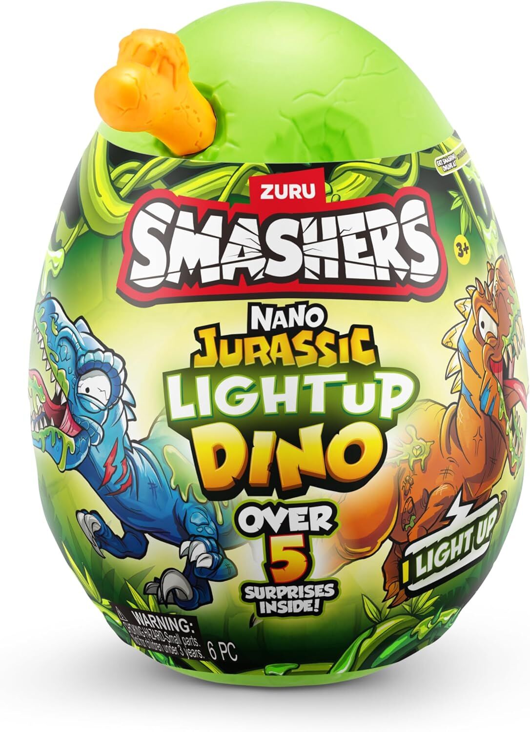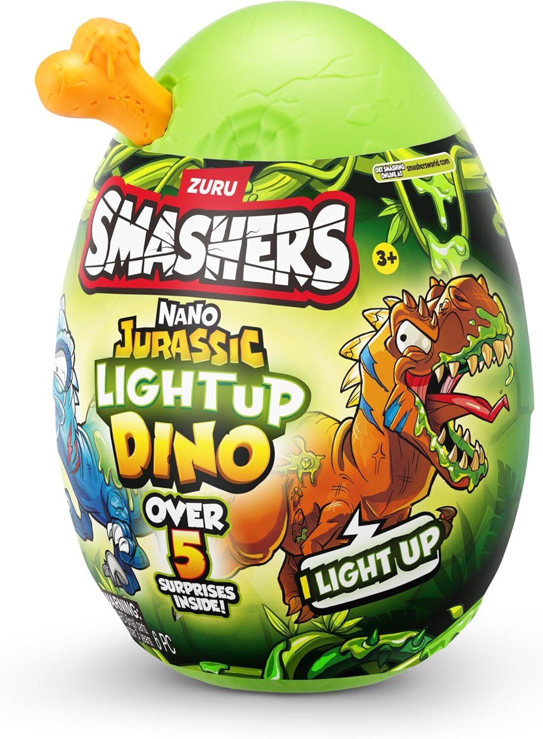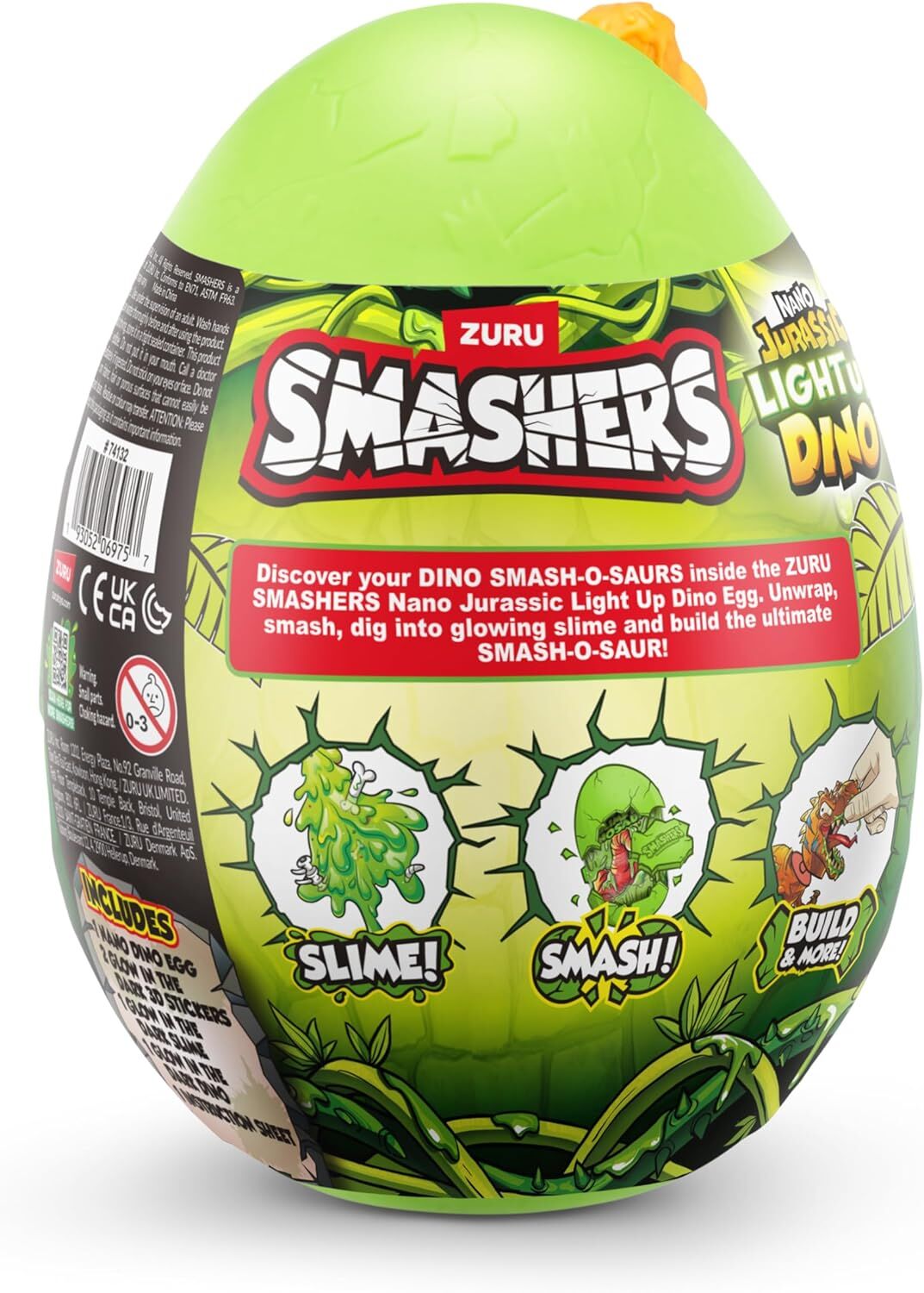 Discover your DINO SMASH-O-SAURS inside the ZURU Smashers Nano Jurassic Light Up Dino Egg. Unwrap, smash, dig into glow-in-the-dark slime, and build the nano SMASH-O-SAUR! Unleash a prehistoric adventure with our glow-in-the-dark dinosaur toy, lighting up the night and bringing ancient wonders to life. Smash through over five epic surprises, including gooey slime, dino parts and glow-in-the-dark stickers! Dig to find your Dino pieces and reveal surprise characters. With six dino characters to collect, the excitement never ends! Get smashing and explore the thrilling world of Smashers!ZURU Smashers Jurassic Light-Up Nano Egg